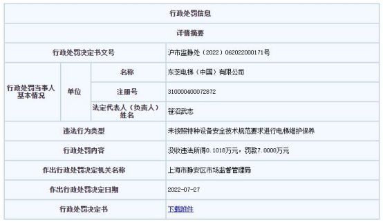 东芝电梯上海违法被罚 未按技术规范要求维护保养电梯